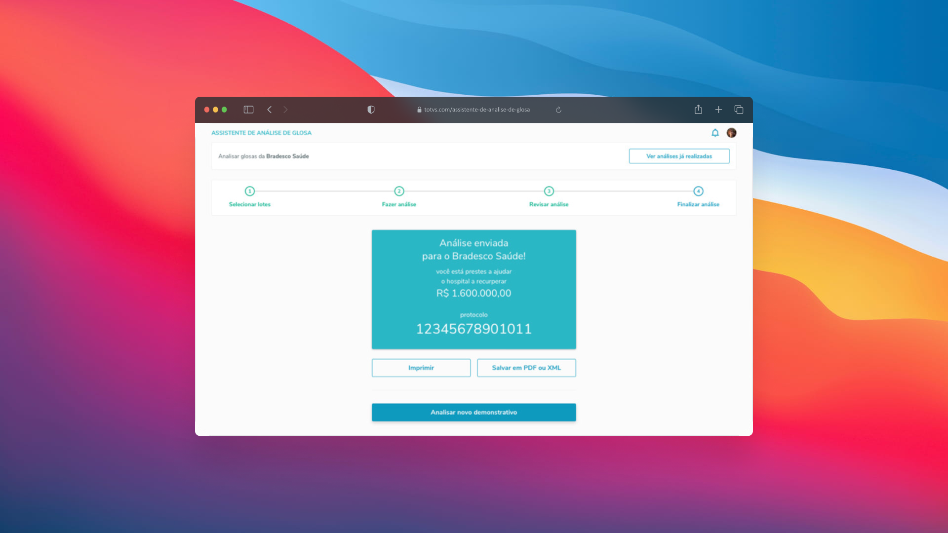 I led a design sprint with a team of five and close collaboration with users and stakeholders. We delivered the Assistente de Análise de Glosa: stepped flow (Select batches → Fazer análise → Revisar → Finalizar), view modes (all items / by reason / by account), inline Recursar form with justification and attachment, and success screen with protocol, print/PDF/XML, and list of analyses realizadas. Final designs in Sketch and Zeplin.