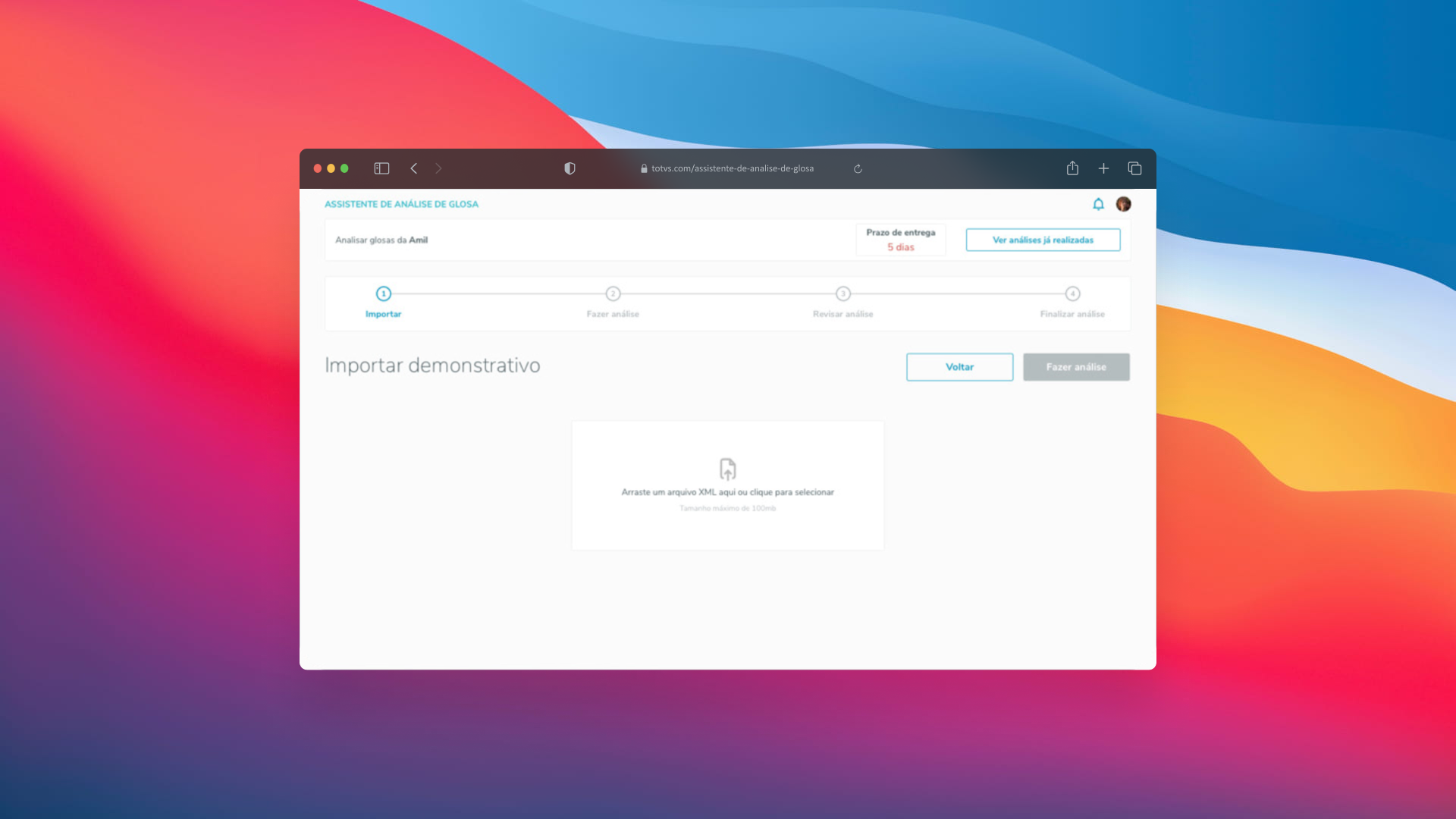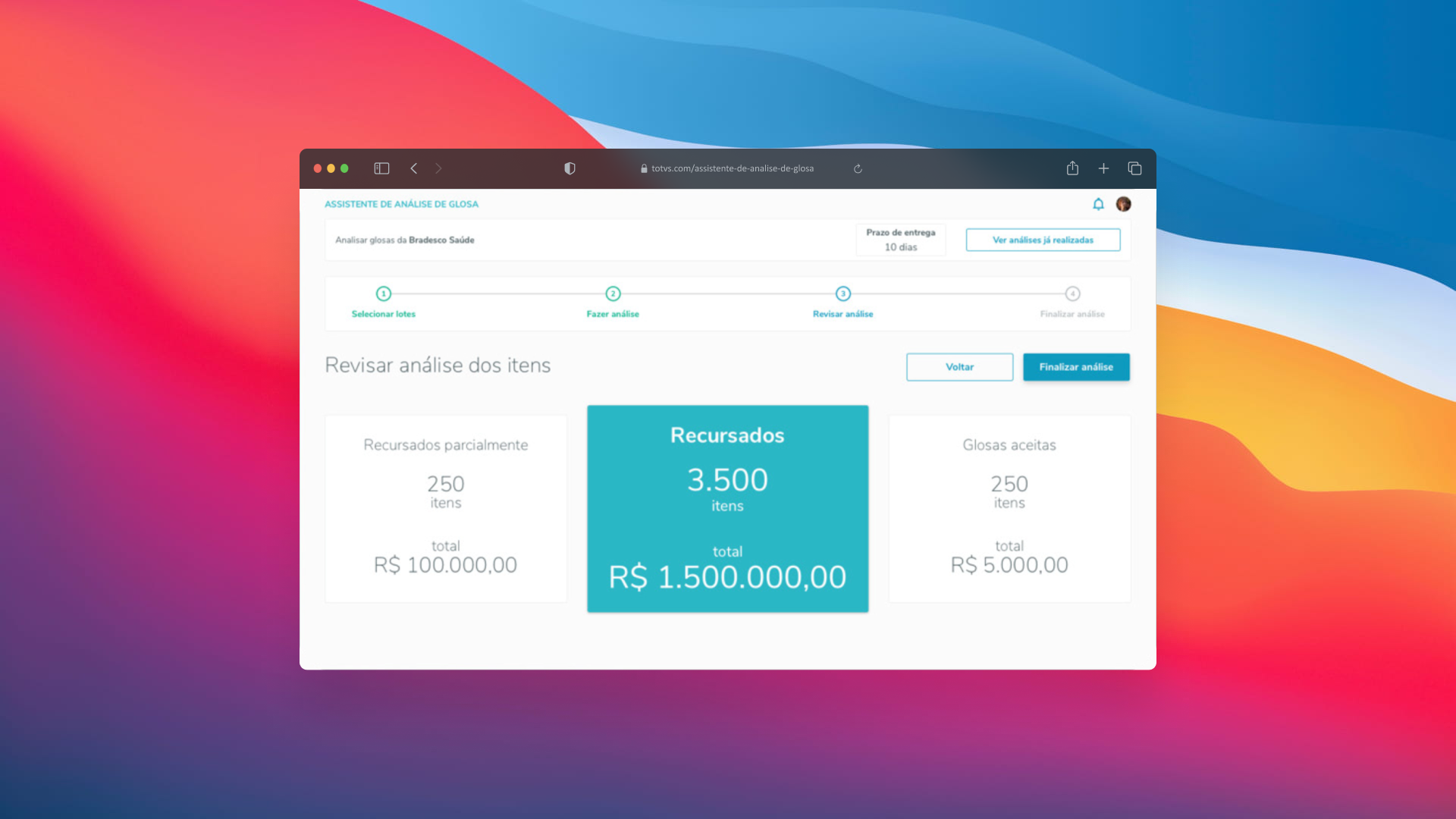 Hospital billing audits were cumbersome: viewing statements, importing data, analyzing items by reason for denial, and appealing or accepting glosas was fragmented. Users needed a controlled flow to select or import statements, analyze by batch or reason, and send results to health plans (convênios).