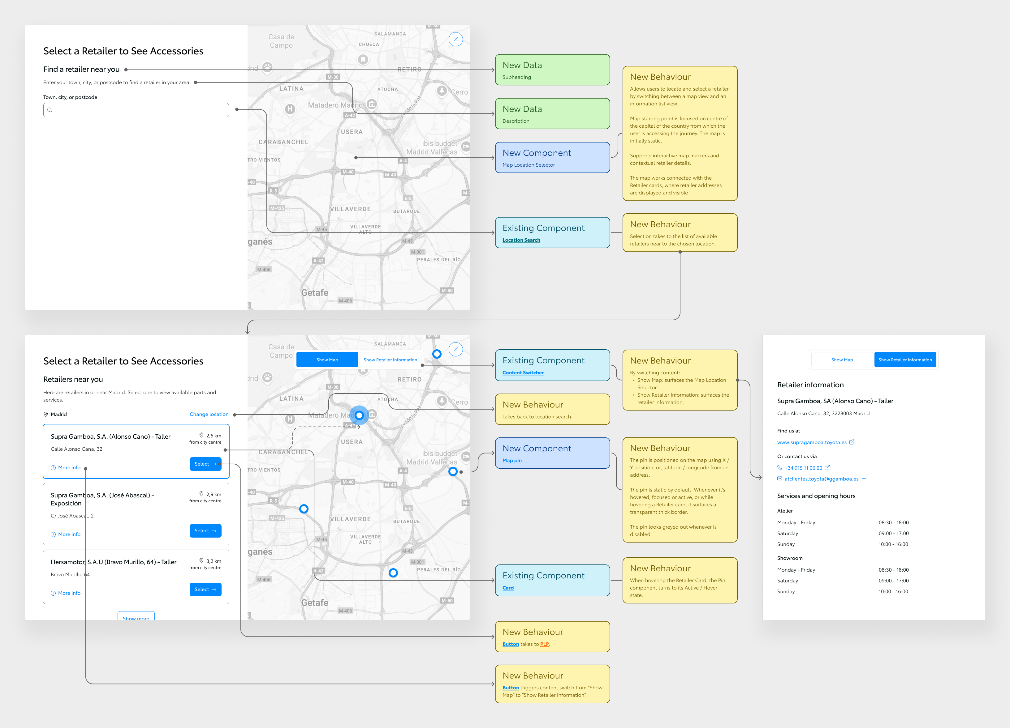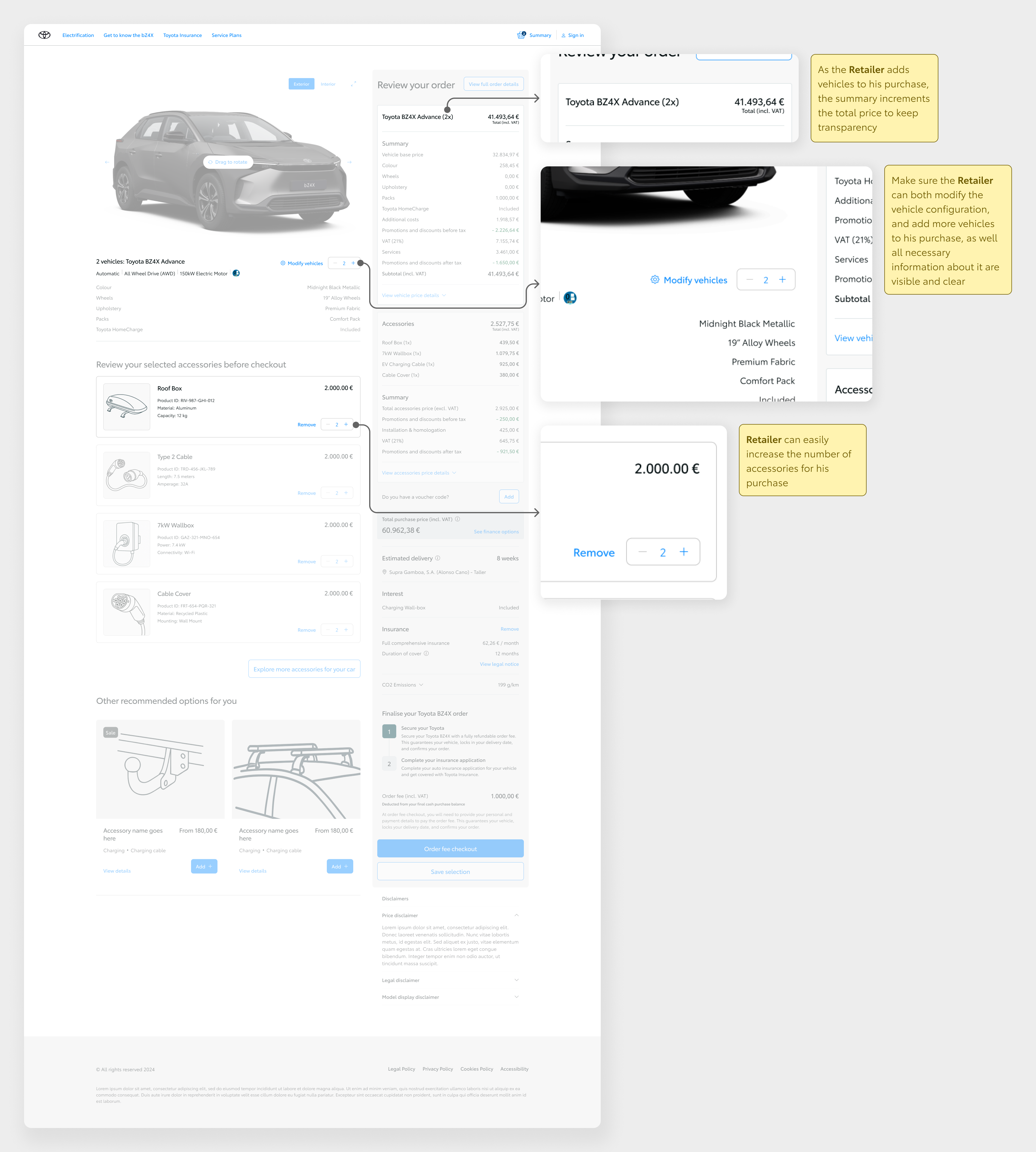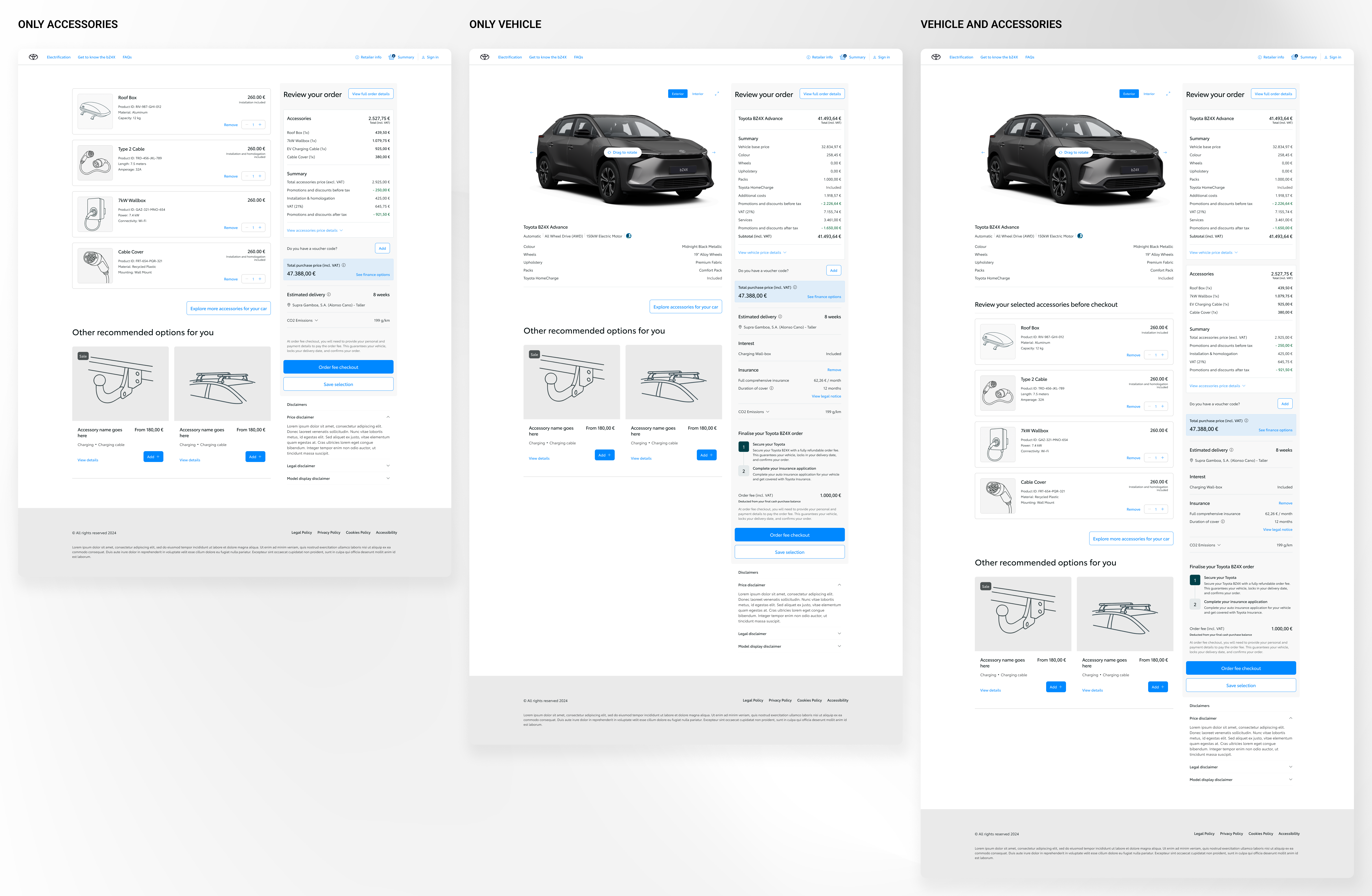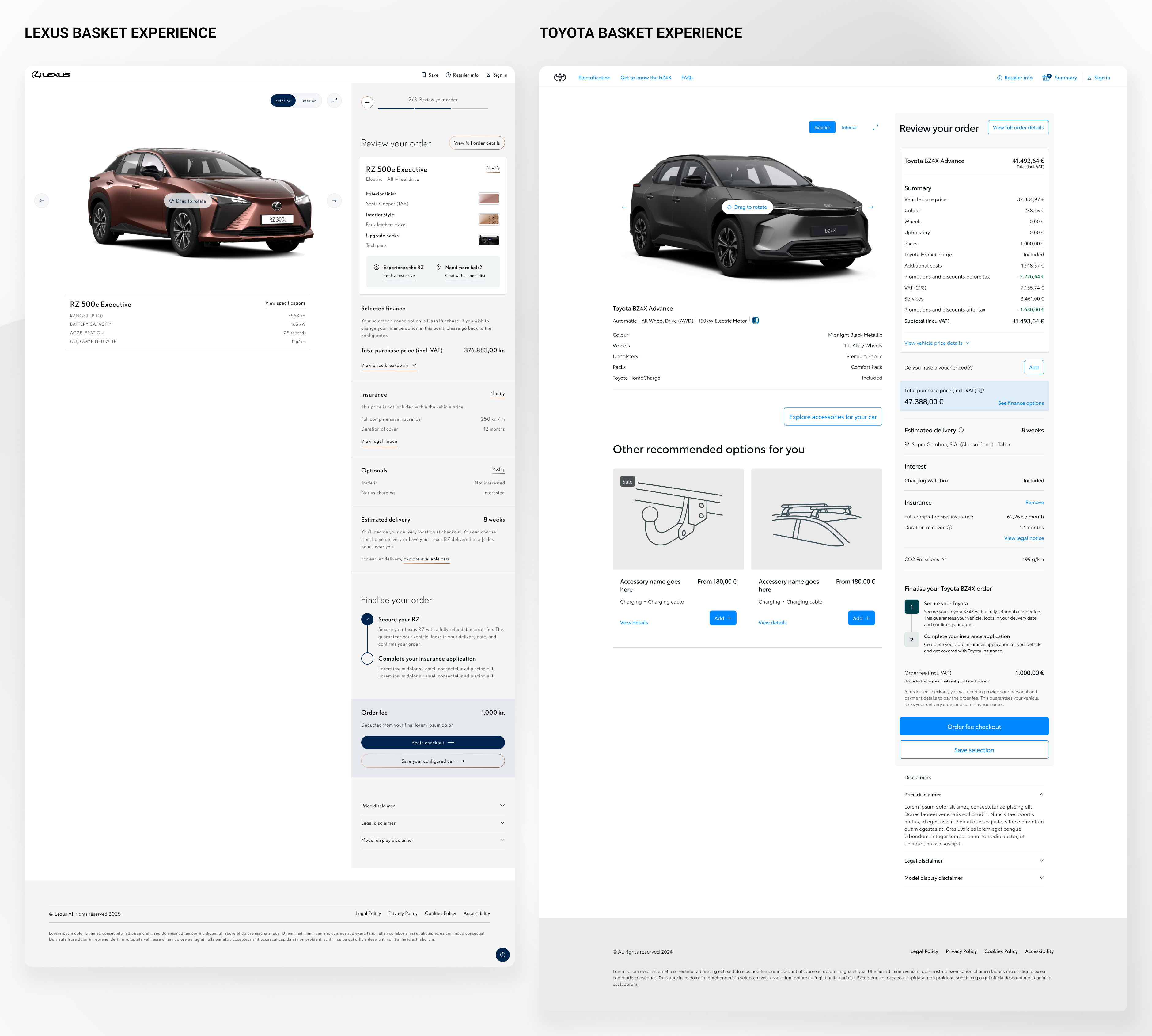We mapped accessory logic across configuration and post-purchase, defined a journey architecture (vehicle selection → configuration → accessory integration → checkout; post-purchase entry → browsing → recommendations → purchase), and aligned on a scalable component-based approach with CDS. Unified component strategy with brand-level adaptation for Toyota and Lexus; design and development evolved in parallel.