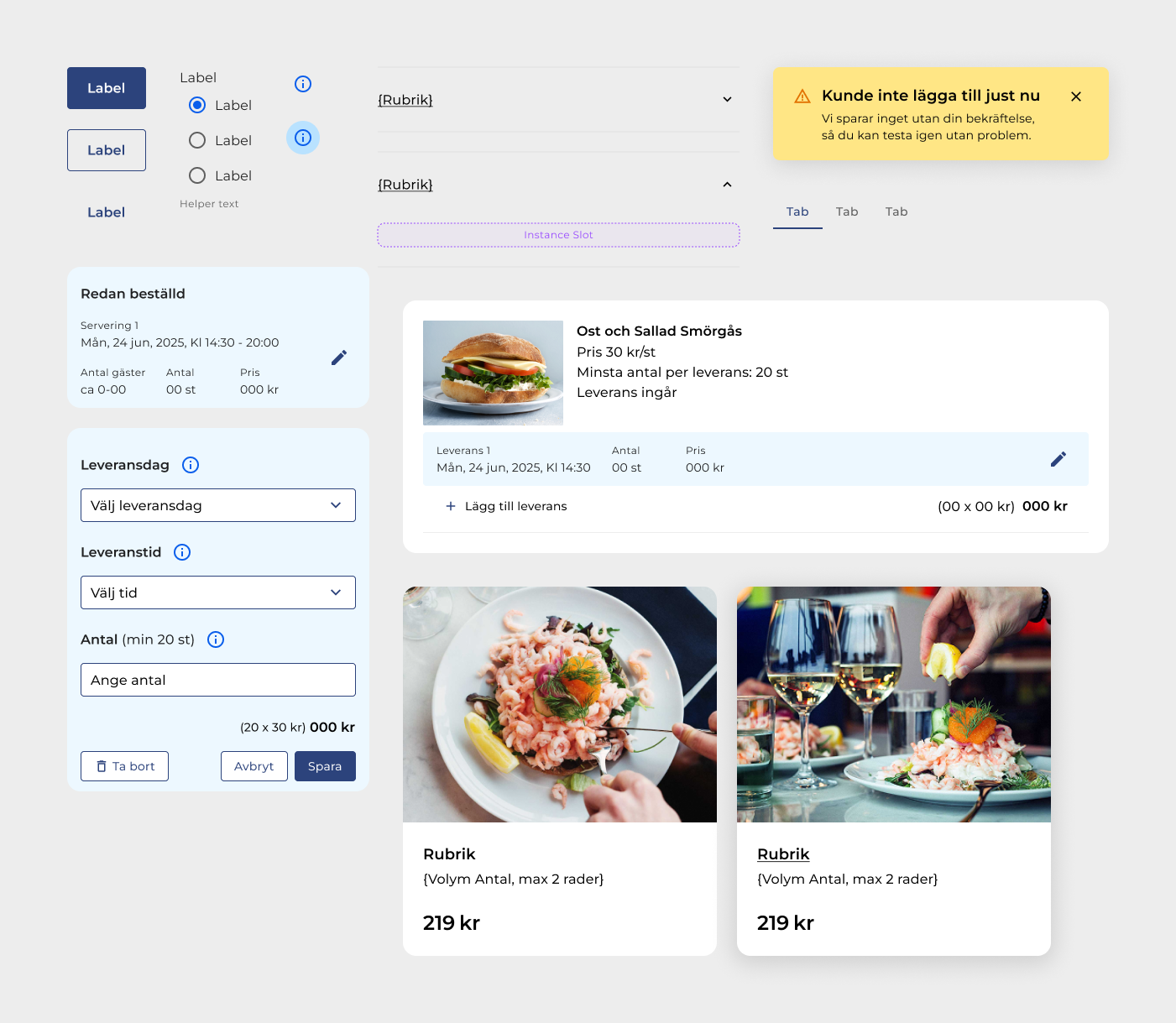 As UX/UI Designer I defined the UX concept and built a modular Design System based on MUI, aligned with React. The portal is built around three pillars—Min företagssida (task hub), E-commerce, Knowledge—unified by a behavioral layer of guidance. Independent task modules, layered tokens and components, and design–frontend alignment in parallel enabled a foundation for future expansion.