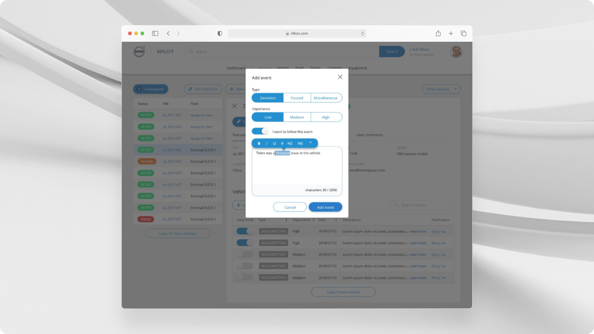 I led user interviews and prototype validation in an agile team with PO, Scrum Master, and Backend Developer. The REFLECT UI emerged: vehicle list with filters, detailed vehicle panel with events, Add event modal, and a step-by-step unassigned-vehicles flow with optional combine-similar. Implemented with HTML, CSS, and AngularJS.